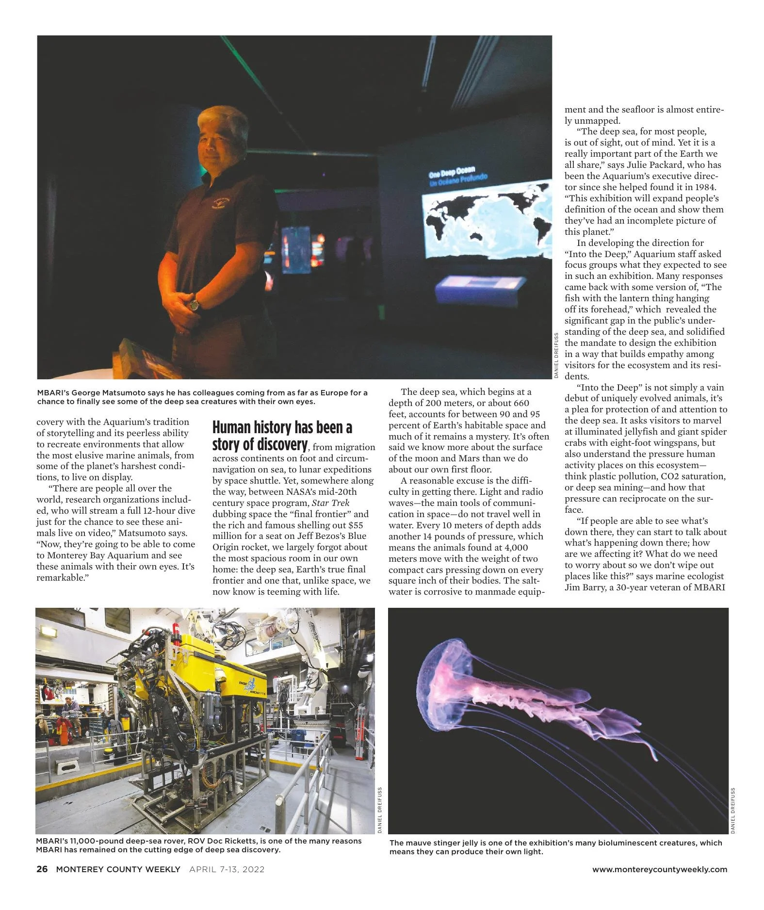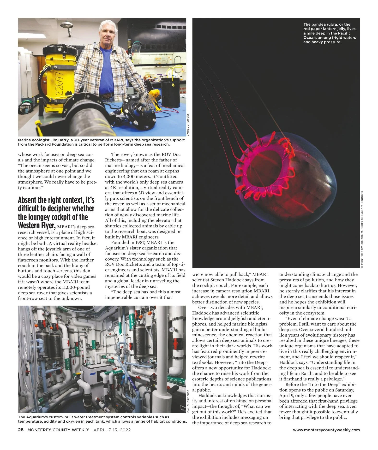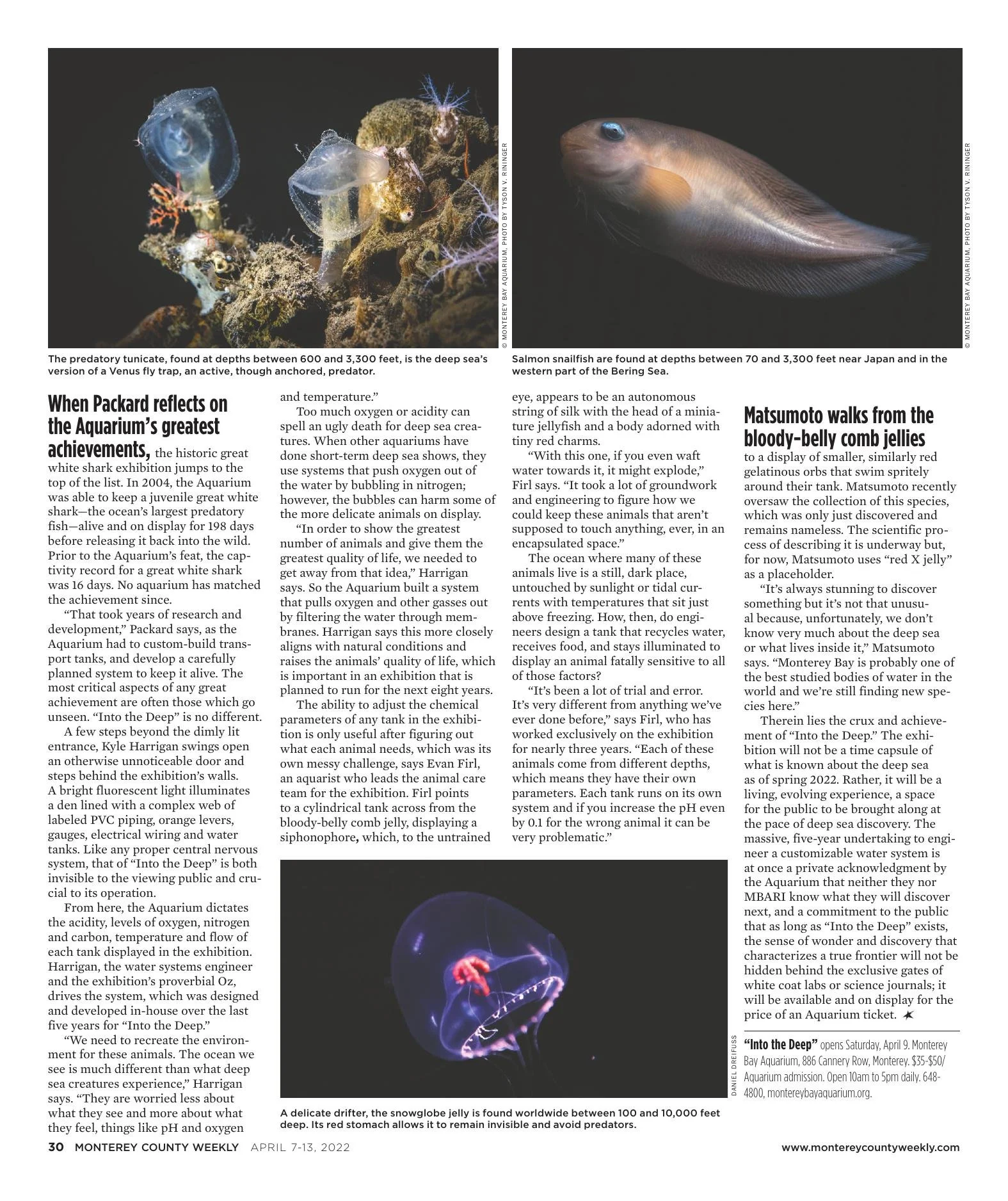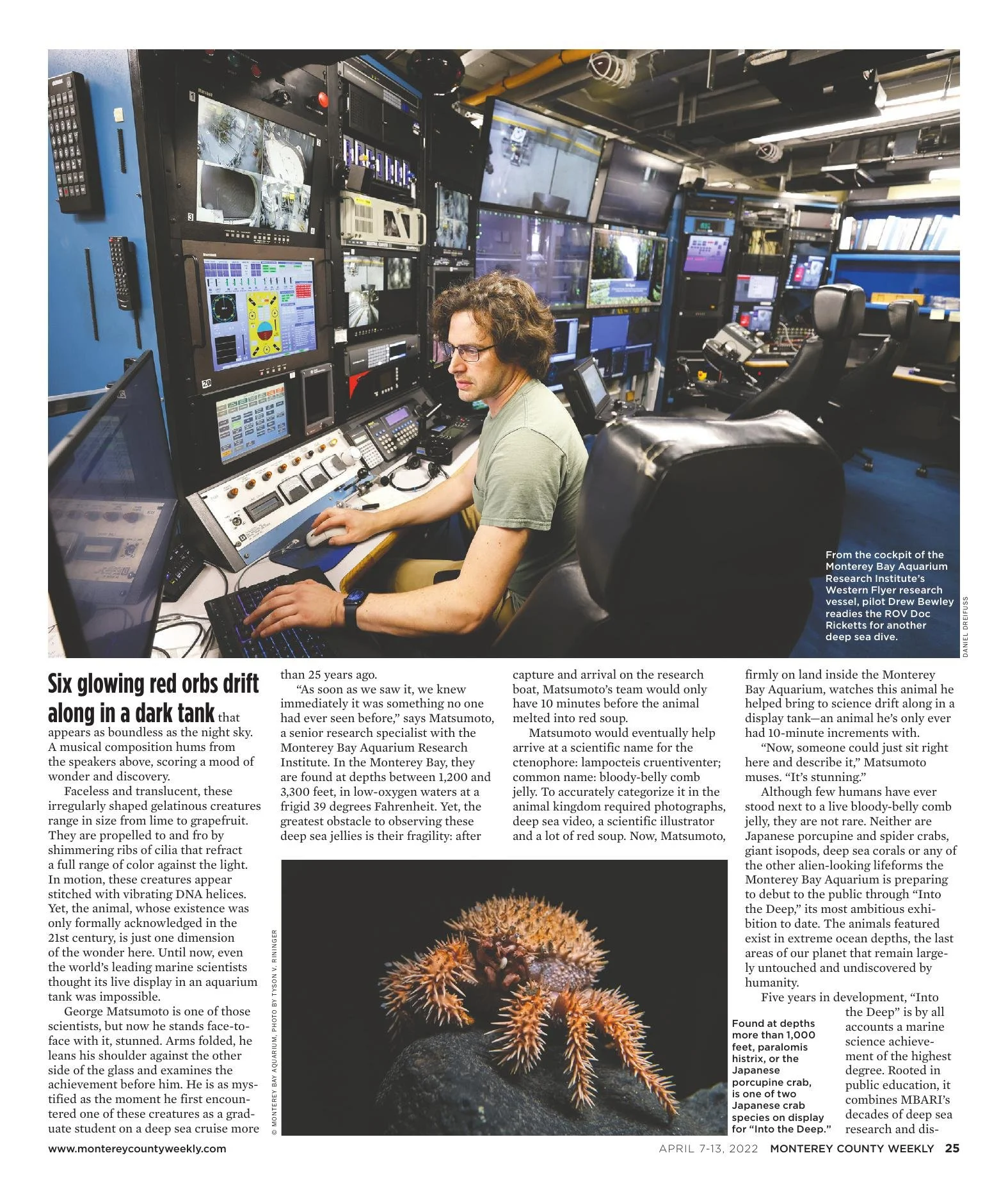 Since the 1980s, the Monterey Bay Aquarium Research Institute has operated as the NASA of deep-sea research. The research organization in Monterey County, CA continues to shape our understanding of the world’s underbelly, yet, its greatest achievement may be an exhibition it debuted in April 2022 at the globally-renowned Monterey Bay Aquarium. Long seen as impossible, MBARI and the Aquarium worked for five years to develop cutting-edge technology that allows creatures that live at depths of thousands of feet to be displayed, alive, in an Aquarium space. Many of the animals on display have never been observed beyond video footage. The exhibition has attracted marveling marine scientists from across the globe.